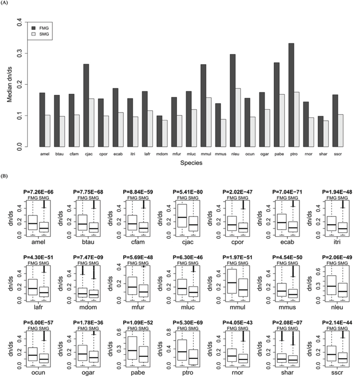 Figure 2: Comparison of the evolutionary rate, dn/ds, between SM and FM genes. A. A bar chart of the SM genes against the FM genes. B. Box plots of the SM genes against the FM genes for each of the 21 species.