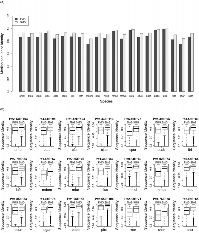 We aligned the orthologous proteins between human and the other 21 species using BLASTP software. For SM and FM genes, we extracted the sequence identity from the alignment results. Comparing the medians (Figure 3A) showed that the SM genes had a higher protein sequence identity across all species (Wilcoxon signed rank test, P = 6.41E-05). Furthermore, we also compared the protein sequence identity between SM genes and FM genes in each of the 21 species. The protein sequence identity of SM genes was significantly higher than that of the FM genes for each species (Figure 3B). This also indicated that the SM genes were more conserved than the FM genes. Supplementary Table S2 showed the detailed information about the sequence identity for each species.
