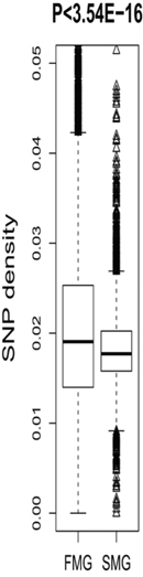 The SNP data were downloaded from the NCBI SNP database (http://www.ncbi.nlm.nih.gov/SNP/) [37]. The ID numbers (rs#) and positions of the SNPs were extracted. We then downloaded the location information (start and end position) of SM and FM genes from NCBI (ftp://ftp.ncbi.nlm.nih.gov/genomes/MapView/), and mapped the SNPs to the SM and FM genes based on the chromosomal location. Finally, we calculated the SNP density (the number of SNPs divided by the length of the gene) for each SM or FM gene.