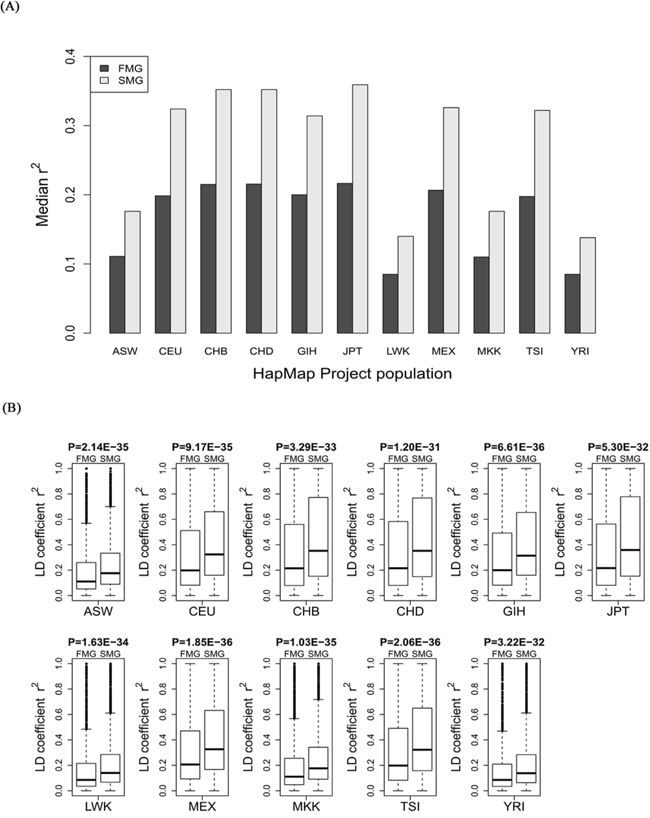 Figure 5: Comparison of the r2 value between SM and FM genes. A. A bar chart of the SM genes against the FM genes. B. Box plots of the SM genes against the FM genes for each of the 11 HapMap populations.