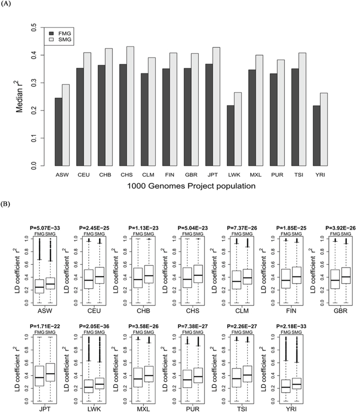 Figure 6: Comparison of the r2 value between SM and FM genes. A. A bar chart of the SM genes against the FM genes. B. Box plots of the SM genes against the FM genes for each of the 13 1000 genomes project populations.