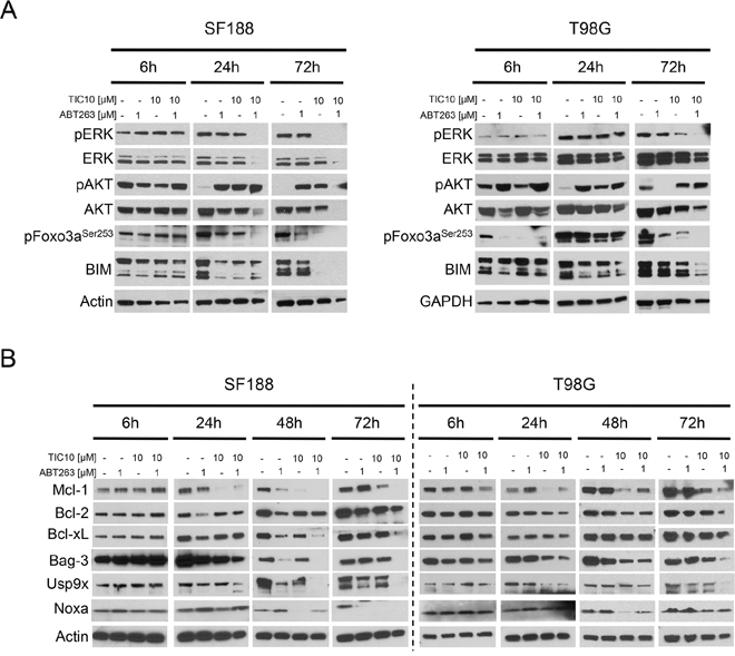 Figure 3: Combined treatment with ABT263 and TIC10/ONC201 yields down-regulation of ERK signaling as well as of the Mcl-1/Bag3/Usp9X network. A. SF188 and T98G glioblastoma cells were treated for indicated lengths of time with ABT263, TIC10/ONC201, both agents or solvent under serum starvation. Whole-cell extracts were examined by Western blot for pERK, ERK, pAKT, AKT, pFoxo3a and BIM. Actin Western blot analysis was performed to confirm equal protein loading. B. SF188 and T98G glioblastoma cells were treated as described for A prior to collecting whole-cell extracts and performing Western blot analysis for Mcl-1, Bcl-2, Bcl-xL, Bag3, Usp9X and Noxa. Actin served as a loading control.