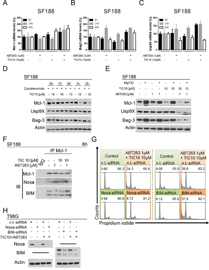 Figure 4: Down-regulation of Mcl-1 is mediated through enhanced proteasomal degradation. A. SF188 glioblastoma cells were treated for 6 h, 24 h or 48 h with ABT263, TIC10/ONC201, both agents or solvent under serum starvation prior to collecting RNA and performing rtPCR for MCl-1 (A), Bag3 (B) or Usp9X (C) Columns, means of the percentage of mRNA expression normalized to control. Bars, SD. D. SF188 glioblastoma cells were treated with the protein synthesis inhibitor cycloheximide (10 μg/ml) in the presence or absence of TIC10/ONC201 for the indicated lengths of time. Western blot analysis was performed for Mcl-1, Usp9X and Bag3. Actin expression was determined to confirm equal protein loading. E. SF188 pediatric glioblastoma cells were treated with ABT263, TIC10/ONC201, both or solvent in the presence or absence of the proteasome inhibitor MG132 (10 μM) for 5 h. Whole-cell extracts were collected prior to Western blot analysis for Mcl-1, Usp9X and Bag3. Actin expression was determined to confirm equal protein loading. F. SF188 glioblastoma cells were treated for 6 h with ABT263, TIC10/ONC201, both agents or solvent under serum starvation. Whole-cell extracts were collected prior to immunoprecipitation (IP) for Mcl-1. IP with murine non-specific IgG served as negative control. Western blot analysis for Mcl-1, Noxa and BIM was performed for the immunoprecipitate. G. T98G glioblastoma cells were treated with non-targeting (n.t.)-siRNA, Noxa-siRNA or BIM-siRNA followed by a treatment with TIC10/ONC201/ABT263 or solvent for 24 h. Staining for propidium iodide was performed prior to flow cytometric analysis. Representative histograms are shown. H. T98G glioblastoma cells were treated as described for G. Whole-cell extracts were collected and analysed by Western blot for Noxa and BIM to confirm successful knock-down. Actin Western blot analysis was performed to ensure equal protein loading.