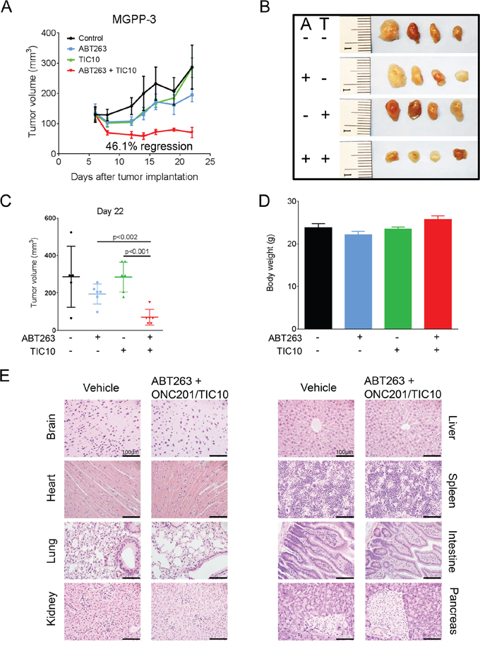 Figure 6: Combined treatment with ABT263 and TIC10/ONC201 results in an enhanced inhibition of tumor growth in vivo. 5 × 105 MGPP-3 glioblastoma cells were implanted subcutaneously. After tumor formation animals were treated intraperitoneally with vehicle (n = 5 tumors), ABT263 (25 mg/kg; n = 6 tumors), TIC10/ONC201 (25 mg/kg; n = 6 tumors) or both agents (n = 6 tumors) 3 times a week for 2 weeks. A. tumor growth curves showing the increase in tumor size for each treatment group. Data are presented as mean and SEM. B. representative photographs of the tumors; A = ABT263, T = TIC10/ONC201. C. quantification and statistical analysis (Student’s t-test) of the tumors of the different treatment groups 22 days after tumor implantation. D. graphical representation of the bodyweight of the animals on day 22. Data are presented as mean and SEM. E. representative microphotographs showing the histological morphology (H & E staining) of the indicated organs among representative animals receiving treatment either with vehicle or the combination of ABT263 and TIC10/ONC201. Magnification, x40; scale bar, 100 μm.