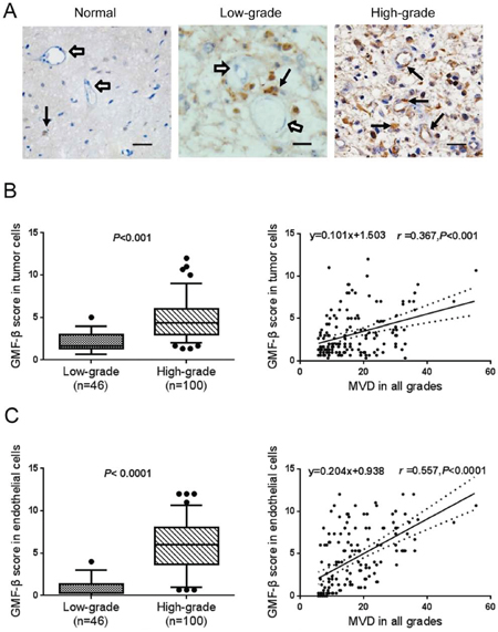 Figure 1: GMF-β expression is positively associated with tumor grade and microvessel density (MVD) in human glioma. A. Distributions of GMF-β in normal brain tissue (left panel), low-grade (middle panel) and high-grade glioma (right panel). Solid arrows, GMF-β staining (brown); open arrows, negative staining; Scale bar: 50 μm. B. IHC-score for GMF-β expression in tumor cells of different grades (left panel); correlation of microvessel densities and tumoral GMF-β expression (right panel). C. IHC-score for GMF-β expression in endothelial cells in gliomas of different grades (left panel); correlation of microvessel densities and endothelial GMF-β expressions (right panel).