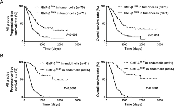 To elucidate the role of over-expressed GMF-β in glioma, we investigated the relationship between GMF-β expression and the clinicopathological features. We first analyzed the correlations of patient survivals with GMF-β expressions status in different tissues of glioma. Kaplan-Meier analysis revealed significant association of higher GMF-β expression in tumor cells with shorter progression-free survival (PFS, Figure 2A, left panel) and overall survival (OS, Figure 2A, right panel) in patients of all WHO grades (P < 0.001). Comparing to high GMF-β expression in tumor cells, over-expression of GMF-β in vascular endothelia resulted in much shorter PFS and OS (P < 0.0001; Figure 2B).