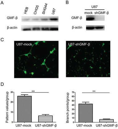 Figure 4: Tubulogenesis of human U87 glioblastoma cells is inhibited by GMF-β knockdown. A. Protein levels of GMF-β in human glial cell line (HEB) and human glioma cell lines of the different grades (CHG5, SHG44, U87). B. Assessment of GMF-β knockdown in U87 cells by western blotting. C. Tube formation by U87 mock cells (left panel); impaired tube formation by U87-shGMF-β cells (right panel). Inspection under a phase contrast fluorescent microscope (× 100). D. Quantified tubulogenesis of U87 mock cells and U87-shGMF-β cells by pattern recognition system (left panel) and branch point counting system (right panel).*** indicates significant difference with P < 0.001.