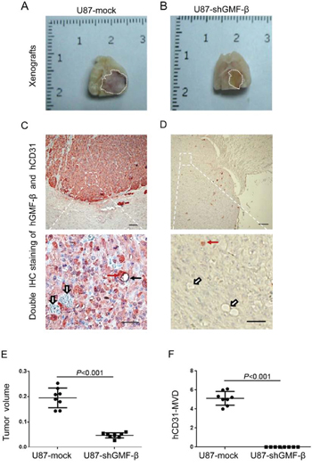 Figure 5: GMF-β knockdown suppresses tumor growth and the formation of human-CD31 positive microvessels (hCD31-MVs) in orthotopic U87 xenograft models. A. The cross-sectional appearance of xenografted gliomas from U87-mock group B. The cross-sectional appearance of xenografted gliomas from U87-shGMF-β group. Gross tumor boundaries were delineated by white dotlines. C. A hCD31-microvessel and several hCD31-negative vessels in U87-mock tumor. D. No hCD31-MVs, only hCD31-negative vessels in U87-shGMF-β tumor. Red solid arrows indicate hGMF-β staining in tumor cells, black solid arrows show hCD31 staining on microvasular endothelia, and open arrows denote vessels negative for hCD31. Scale bar: 100 μm in upper pannels; 50 μm in lower pannels. E. Quantitative comparisons of gross tumor volume between U87-mock and U87-shGMF-β group. F. Quantitative comparisons of hCD31-microvessel densities (MVDs) between U87-mock and U87-shGMF-β group.