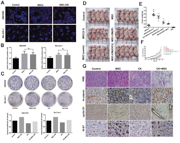 In order to determine whether MSCs exhibit tumor supportive or inhibitory effect on cholangiocarcinoma cells, we performed a co-culture experiment. QBC939 and Mz-ChA-1 cells were mixed with MSCs cells or MSC-CM produced from corresponding amount of MSCs. 24 hours later, proliferation ability was tested by Edu assay. The MSCs-induced promotion effects on cancer cell proliferation were significantly greater than in controls. The conditioned medium from MSCs also showed a remarkable effect (Figure 1A, 1B). To investigate whether MSCs enhances the colony-forming ability of QBC939 and Mz-ChA-1 cells in vitro, we seeded 500 cells in triplicate wells of six-well plates for a colony-forming assay. After cell adherence, cells were cultured with CK (5 μM) or MSC-CM for 12 hours. 2 weeks later, cells treated with MSC-CM formed clones were more numerous and larger than in control groups (Figure 1C). CK could inhibit the cholangiocarcinoma cells tumorigenesis, while MSC-CM have the ability to relieve the inhibiting effects of CK. Next, in order to determine the effect of MSCs on tumor growth in vivo, we established a xenograft model which QBC939 cells were mixed with MSCs and injected subcutaneously into immunocompromised mice. The growth kinetics of the MSC-containing tumors were compared to those of QBC939 injected alone over the 1–5 weeks. Besides, the results of the tumor weight, histopathology of the tumors were studied. As shown in Figure 1D, 1E, and 1F, The tumor mean volume and weight of the mixed-cell group and MSCs-treated group are dramatically higher than the control group. The mixed-cell group showed the highest record among all the groups. The expression of Ki67 in cancer tissues was shown in Figure 1G. The Ki67-positive cells exhibited brown punctate granules in the nucleus. We can see a higher expression of Ki-67 when QBC939 mixed with MSCs or MSC-CM. These results revealed that MSCs and MSC-CM promoted cholangiocarcinoma growth and tumorigenesis in vitro and in vivo.