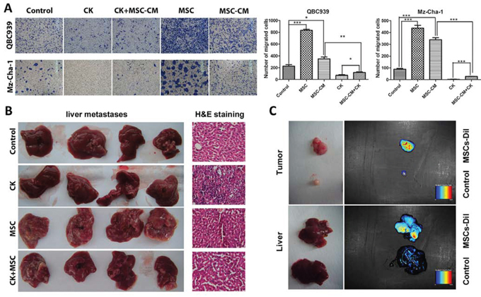 Figure 2: MSCs promote cholangiocarcinoma cancer metastasis. A. QBC939 cells and Mz-ChA-1 cells were planted into up chamber of transwell with serum-free medium, MSC-CM or MSCs were in the down chamber, after 48 hours, the cells migrated to the bottom chamber were visualized by staining. Quantification is shown at right. B. Liver migration in different groups, and the H&E staining of each group. C. MSCs recruited to the tumor sites and metastatic livers of the tumor bearing nude mice. Data are reported as means ± S.D. of three separate experiments, * and ** indicate p < 0.05 and p < 0.01 compared with control group, respectively. Abbreviations: MSCs, mesenchymal stem cell; MSC-CM, mesenchymal stem cells conditioned medium; CK, compound K.