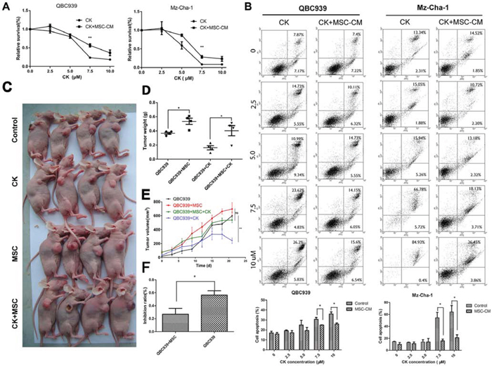 Figure 3: MSCs decrease the effects of Compound K on cholangiocarcinoma. A. QBC939 and Mz-ChA-1 cells were treated with different concentration of CK (0, 2.5, 5.0, 7.5, 10 μM), which were dissolved with MSC-CM or serum-free medium for 24 hours. Cells were analyzed with MTS assy. Data are reported as means ± S.D. of three replicates. B. QBC939 and Mz-ChA-1 cells were treated with different concentration of CK (0, 2.5, 5.0, 7.5, 10 μM), at the same time, cells were treated with MSC-CM or serum-free medium for 24 hours and analysis with Flow Cytometry. Statistical results are shown below. C. QBC939 cells were implanted into nude mice alone or mixed with MSCs. After tumor emerges, mice were treated with CK (10 mg/kg) every other day. D–F. Tumor volume, weight and CK inhibit ratio were analyzed (N = 4 mice of each group). Data are reported as means ± S.D.* and ** indicate p < 0.05 and p < 0.01, compared with control group, respectively. Abbreviations: CK, compound K; MTS, 3-(4,5-dimethylthiazol-2-yl)-5-(3-carboxymethoxyphenyl)-2-(4-sulfophenyl)-2H-tetrazolium.