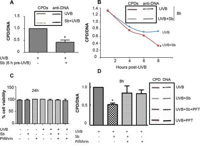 Figure 1: Silibinin repairs UVB-induced DNA damage in NHDFs. A. NHDFs were treated with silibinin (100 μM) for 6 hrs and then exposed to UVB (1 mJ/cm2). Immediately following UVB exposure, cells were trypsinized and cell pellets collected for DNA extraction. Slot blot was performed to detect CPDs; thereafter, membranes were stripped and reprobed with single stranded DNA antibody and bands were visualized using Odyssey IR detection system. B. NHDFs were exposed to 1 mJ/cm2 UVB, treated with silibinin (100 μM) and following an appropriate incubation period (1, 4, 6 and 8 hrs), cells were collected and analyzed for CPDs by slot blot. C. UVB, silibinin and/or pifithrin did not affect the viability of NHDFs. NHDFs were treated with silibinin (100 μM) and/or pifithrin (7 μM) with or without UVB (1 mJ/cm2) exposure for 24 hrs and cell viability was assessed. The graph represents % viable cells mean ± SEM of three samples. D. NHDFs cells were exposed to 1 mJ/cm2 UVB, and immediately treated with silibinin (100 μM) ± pifithrin (7 μM) for 8 hrs and analyzed for CPDs by slot blot. Experiments were repeated at least three times and band intensity was quantified with Image J software. In each case, graph represents the amount of CPDs normalized to the control cells (UVB-treated cells) and presented as mean ± SEM of 3 samples. *; p < 0.05. Abbreviations: Sb: Silibinin; CPD: Cyclobutane pyrimidine dimers.