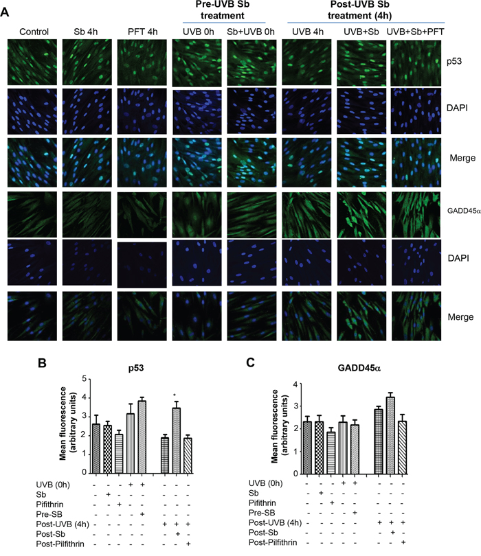 Figure 2: Effect of silibinin treatment on p53 and GADD45α following UVB exposure in NHDFs. A–C. NHDFs were plated on sterile coverslips and divided into two groups: pre- and post-UVB treatment. In the pre-UVB treatment group, cells were treated with silibinin and/or pifithrin for 4 hrs, then washed and exposed to UVB 1 mJ/cm2. Treatment with silibinin or pifithrin alone served as relevant controls. In the post-UVB treatment group, cells were exposed first to UVB 1 mJ/cm2 and then immediately treated with silibinin and pifithrin for 4 hrs. At the end of the described treatments, cells were fixed and processed for confocal microscopy as detailed in the methods. Images were captured at 600x magnification on a Nikon inverted confocal microscope using 488/405 nm laser wavelengths to detect green (p53 or GADD45α) and blue (DAPI) emissions. Three independent experiments were performed in duplicates. Ten pictures were captured from each slide and representative pictures are presented. Images were also processed with Image J software and the bar graph represents the mean cell fluorescence ± SEM of ten measurements from a representative experiment. *; p < 0.05.