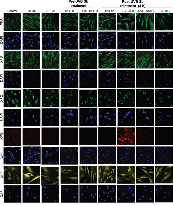 Expression of the NER factors and other DNA damage repair regulators (p53, p21 and GADD45α) was analyzed by immunofluorescence using a confocal microscope. Briefly, NHDFs were seeded onto coverslips, and next day, cells were treated as mentioned above. At the end of the desired treatments, cells were washed and fixed in 4% formaldehyde for 30 minutes at room temperature. After washing with PBS, cells were treated with methanol for 10 minutes at –20°C, then washed again with PBS and blocked with normal goat serum and FBS for one hr at room temperature. After this, cells were incubated overnight at 4°C with primary antibodies for p53, p21, GADD45α, XPA, XPB, XPC and XPG. Cells were then washed with PBS and incubated with specific secondary antibody and DAPI for 60 min. Thereafter, cells were washed in dark and coverslips were mounted for analysis. Cell images were captured at 600x magnification on a Nikon inverted confocal microscope using 633/561/514/488/405 nm laser wavelengths to detect red, yellow, green and blue emissions. Images were processed with ImageJ software.