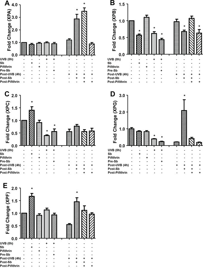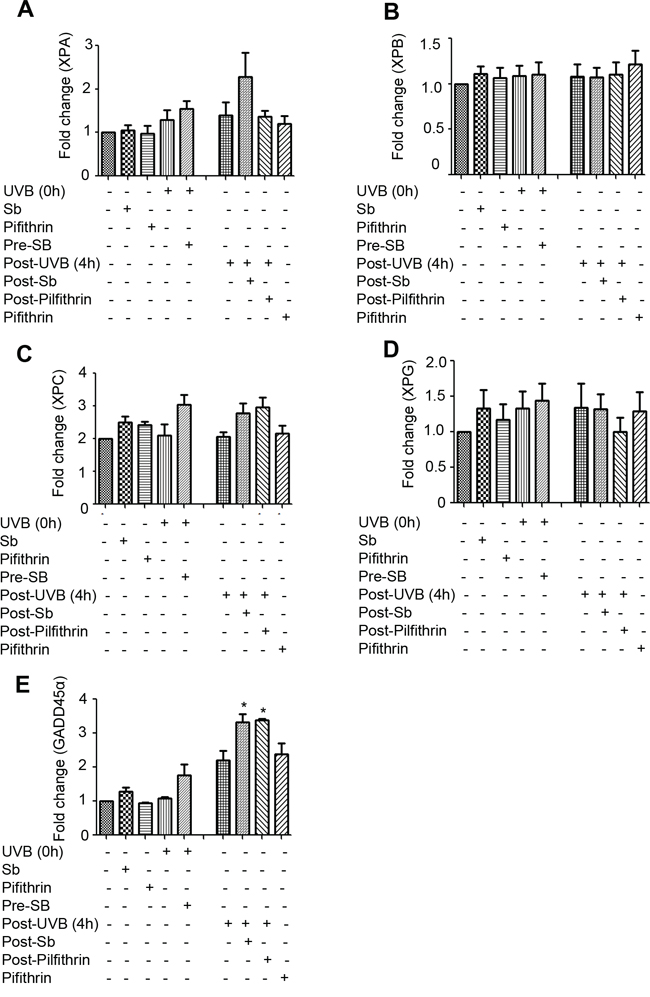 Figure 5: Effect of silibinin treatment on the gene expression of NER regulators and GADD45α in UVB-exposed NHDFs. NHDFs were plated and divided into two groups: pre and post-UVB treatment. In the pre-UVB treatment group, cells were treated with silibinin and/or pifithrin for 3 hrs, then washed and exposed to UVB 1 mJ/cm2. Treatment with silibinin or pifithrin alone served as relevant controls. In the post-UVB group, cells were exposed first to UVB 1 mJ/cm2 and then immediately treated with silibinin and/or pifithrin for 3 hrs. At the end of the described treatments, the mRNA levels of A. XPA, B. XPB, C. XPC, D. XPG and E. GADD45α were measured by real-time RT-PCR as described in methods. Samples were run in triplicate, and three independent experiments were performed for every gene of interest. The mRNA level of gene was normalized to those of β-actin mRNA in each sample. *; p < 0.05.