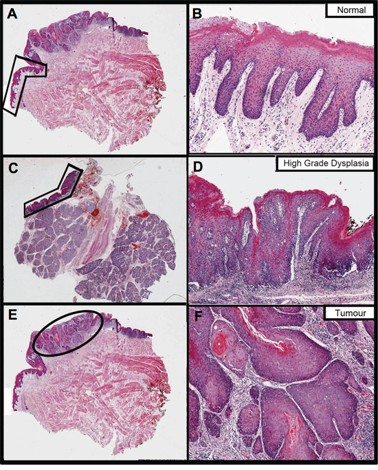 Figure 1: The fixed sections that were H&E stained and annotated to guide RNA extraction from a single patient (ID PG063) in this study. Images on the right are magnifications of the areas annotated on the left, to better show histology. Images A. and B. pertain to the normal oral mucosa sample, images C. and D. to dysplasia and images E. and F. to tumour. Normal and tumour were extracted from the same block whereas dysplasia is from a different block from the same surgery.