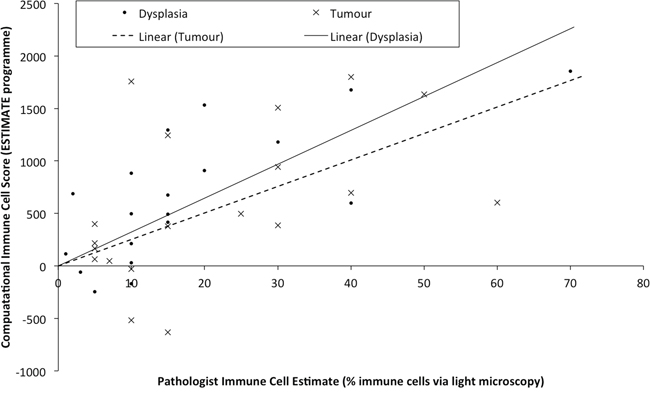 Figure 3: Samples are plotted according to the pathologist estimates of the percentage of immune cells within the macrodissected FFPE tissue (x-axis) versus the immune cell score derived computationally from the transcriptional profile. Linear regression lines for each tissue type are drawn separately as Linear (Tumour) or Linear (Dysplasia).