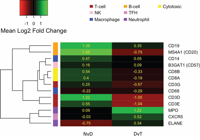 Figure 4: Heatmap indicating the average log2 fold change in expression (yellow values) of commonly used immunohistochemical markers for different immune cell types, as per the left hand colour key and top-right legend. Marker genes (row labels) are clustered according to their expression. NvD: Normal versus Dysplasia. DvT: Dysplasia versus Tumour