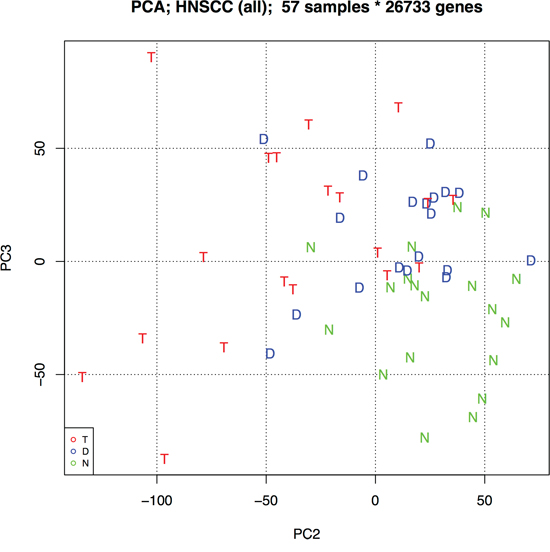 Enrichment in processes involving actin-filaments and the cytoskeleton were also seen in the genes most informative for separating N, D and T in the PCA. This fits with the largest visible changes in the morphology of these sample types, where disorder in the cellular architecture and orientation, as well as evidence of invasion, are used during histopathological diagnosis. Of interest with the PCA is the almost total separation of N and T but partial overlap of D with both groups (Figure 6). Further longitudinal work is warranted, aimed at similarly clustering non OSCC-associated dysplasia samples in these plots and seeing whether, prospectively, those that group with tumour samples have worse prognosis than those that group with normal oral mucosa. It would then be possible to see whether expression changes of adherens junction components are potential prognostic markers for oral dysplasia.