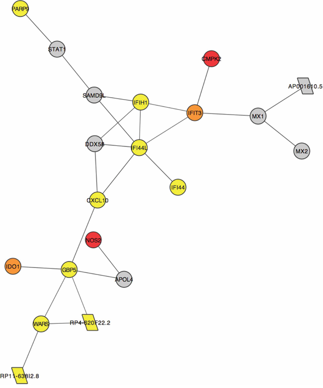 Expressed genes were correlated against one another, as previously described [48]. To ascertain the threshold of significance, 1% of the correlations (~4.42 × 106 values) were selected at random and the correlation values that demarcated the top and bottom 0.0005% were calculated: -0.74 and 0.95. Correlations equal to or outside these thresholds were retained. The resulting network was plotted using Cytoscape v3.0.2, with annotation files indicating, per gene, the type of gene and whether, and between which pairwise comparisons, it was DE.