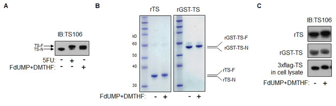 Figure 1: TS modification in vitro. (A) RKO cells were treated with 5FU in culture, and an RKO cell lysate was modified in vitro using FdUMP and DMTHF. IB analysis was done using TS106. (B) Purified rGST-TS and rTS were modified in vitro and analyzed after separation by denaturing gel and Coomassie staining. (C) IB analysis of in vitro-modified rTS, rGST-TS, and 3xFlag-tagged TS in an RKO cell lysate, using TS106.