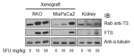 A new rat monoclonal antibody, FTS, recognizes TS-F in 5FU-treated cells and tissues of human and mice. Using FTS in immunoblot assays, we observed dose-dependent responses of 5FU in cell lines and tissues. A progression of the 5FU effect was observed over the time elapsed, subsequent to dosing from 1h to 24h, RKO cells being more sensitive than MiaPaCa2 cells. Additional observations further supported the phosphate group being required for stabilization of the ternary-complex, as suggested by Brody et. al [17]. FTS detected smaller products of rTS-F after proteolytic digestion.