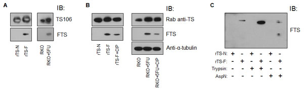 Figure 2: Characterization of moAb FTS. (A) rTS-N, rTS-F, untreated RKO cells and 5FU-treated RKO cells were analyzed by IB using TS106 and moAb FTS. (B) rTS-F and a lysate of 5FU-treated RKO cells were treated with CIP and analyzed by IB as indicated. (B) rTS and rTS-F were digested with trypsin or AspN and analyzed by IB as indicated. Rab, rabbit.