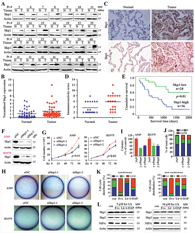 The potential role of Skp1 in lung cancer was evaluated by siRNA-mediated silencing in NSCLC lines A549 and NCI-H1975 (harboring the L858R/T790M-EGFR) [30], and the results showed that knockdown of Skp1 (Figure 1F) led to a significant inhibition of cell growth/proliferation (Figure 1G) and suppression of colony forming activity (Figure 1H, 1I) of the cells. We tested the effect of Skp1 knockdown on cell cycle distribution, and found that in asynchronous H1975 cells, siRNA-mediated Skp1 silencing resulted in G2/M phase arrest (Figure 1J). These results indicate that Skp1 is critical to lung cancer cell proliferation.