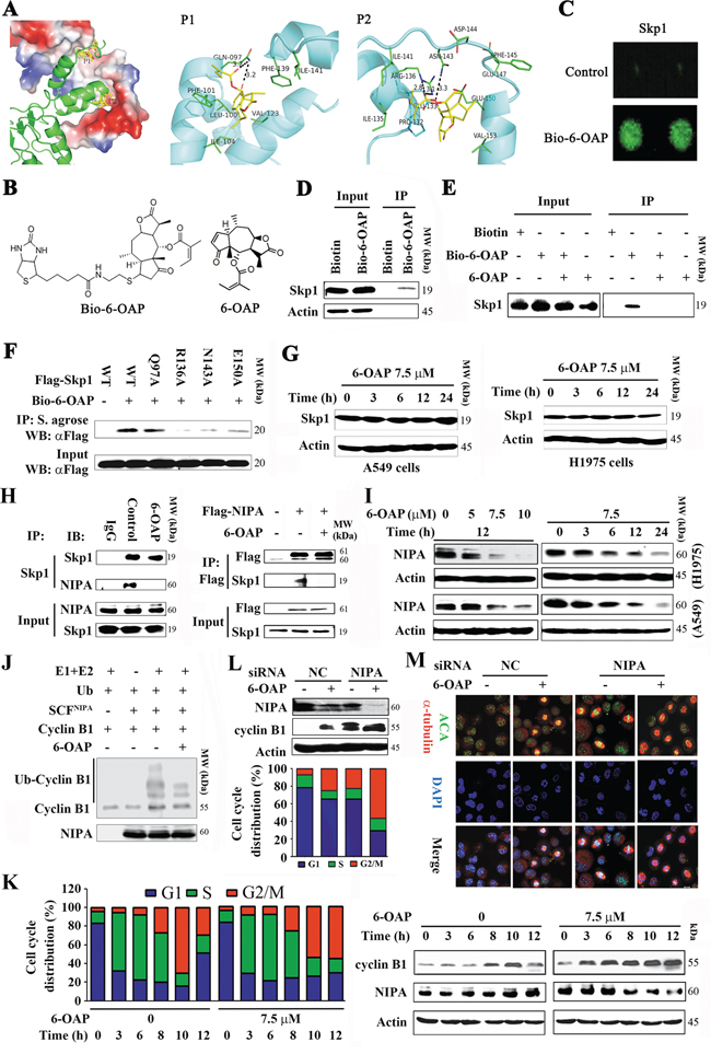 Figure 2: 6-OAP directly binds Skp1 and interferes with SCFNIPA. A. Two potential binding pockets (P1 and P2) of Skp1 for 6-OAP, revealed by docking 6-OAP to Skp1 (PDB code: 2AST). In the left panel, Skp2 (shown as cartoon) interacts with Skp1 (shown as surface) via P1 and P2, and only Skp1 is used during the docking. In the middle and right panels, 6-OAP (shown as sticks) is predicted to interact with Skp1 (shown as cartoon) via P1 and P2, respectively. B. Chemical structure of 6-OAP and Bio-6-OAP. C. Images of Bio-6-OAP-Skp1 interaction on the slides. D. H1975 cells were treated with Biotin or Bio-6-OAP at 50 μM for 6 h, lysed, and the cell lysates were subjected to immunoprecipitation using streptavidin agarose and Western blot using indicated antibodies. E. H1975 cells were treated with Bio-6-OAP (50 μM) in the presence or absence of 6-OAP (100 μM) for 6 h, lysed, and the cell lysates were subjected to immunoprecipitation and Western blot. F. 293T cells were transfected with wild type (WT) or mutant Skp1 for 48 h, lysed, the lysates were subjected to immunoprecipitation using streptavidin (S.) agarose and Western blot using indicated antibodies. G. The cells were treated with 6-OAP, lysed, and subjected to Western blot. H. H1975 cells were treated with or without 6-OAP for 3 h, lysed, and immunoprecipitation and Western blot assays were performed (left panel). 293T cells were transfected with pcDNA3.1-flag-NIPA, treated with or without 6-OAP, and lysed for immunoprecipitation and Western blot (right panel). I. Cells were treated with 6-OAP, lysed, and Western blot was performed. J. An in vitro ubiquitination assay using SCFNIPA, Cyclin B1, and 6-OAP. K. A549 cells were synchronized to G1/S boundary and released, and treated with or without 6-OAP. Cell cycle distribution was determined (left), and the expression of NIPA and Cyclin B1 was analyzed by Western blot (right). L. A549 cells transfected with control or NIPA specific siRNA were treated with 6-OAP for 12 h, harvested for Western blot (upper) or flow cytometry analysis (lower). M. A549 cells transfected with NIPA-specific siRNA were treated with or without 6-OAP (7.5 μM) for 12 h, and analyzed by immunofluorescence labeling with anti-centromere sera, anti-α-tubulin antibody, and DAPI. Size bar, 5 μm.