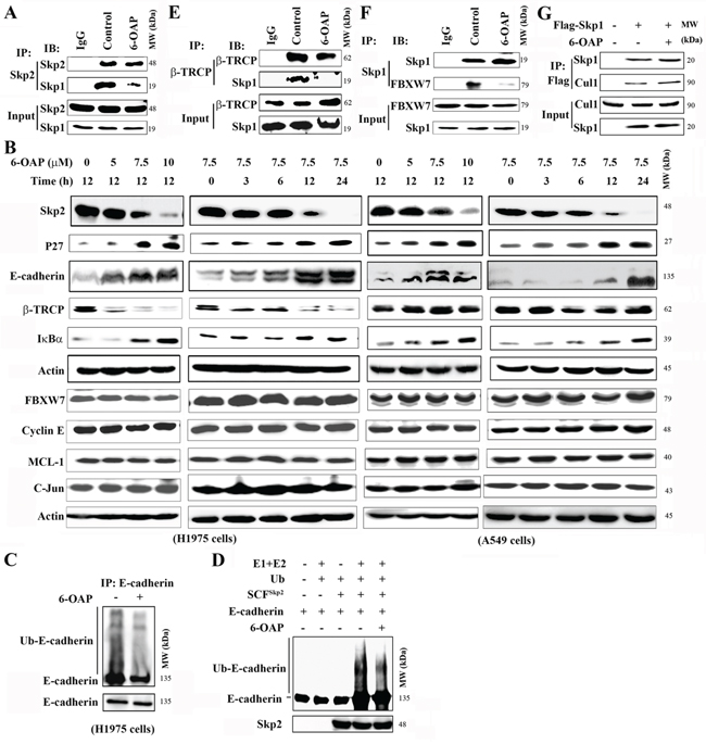 Figure 3: Effects of 6-OAP on Skp2, β-TRCP, Fbxw7 and their substrate proteins. A. H1975 cells were treated with or without 6-OAP for 3 h, lysed, and immunoprecipitation and Western blot were performed using indicated antibodies. B. The cells were treated with 6-OAP, lysed and subjected to Western blot. C, D. 6-OAP inhibited ubiquitination of E-Cadherin, revealed by immunoprecipitation and Western blot in H1975 cells upon 6-OAP (C) and an in vitro ubiquitination assay using SCFSkp2, purified E-Cadherin and 6-OAP (D). E, F. H1975 cells were treated with 6-OAP, lysed, and analyzed by immunoprecipitation and Western blot. G. 293T cells were transfected with Flag-Skp1 and treated with 6-OAP, lysed, and the lysates were subjected to immunoprecipitation and Western blot assays.