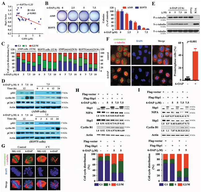 Figure 4: 6-OAP induces prometaphase arrest in lung cancer cells. A. The GI50s of 6-OAP in cells is associated with the relative Skp1 expression. B. Effects of 6-OAP on clonogeinc activity of lung cancer cells. C. The synchronized or asynchronous (asyn) to G1/S boundary cells were treated with 6-OAP at indicated concentrations for 12 h. Cell cycle distribution was determined by propidium iodide (PI) staining and flow cytometry analysis. D. The cells were treated with 6-OAP, lyzed, and Western blot was performed using antibodies indicated. E. The cells were treated with 6-OAP, taxol (50 nM) or Vincristine (VCR; 50 nM) for 12 h. The polymerized (P) and soluble (S) tubulin fractions were prepared and subjected to Western blot using anti-α-tubulin antibody. T-α-tubulin, total-α-tubulin. F. A549 cells were treated with 7.5 μM 6-OAP for 12 h, and assayed by immunofluorescence labeling with anti-centromere sera (green), anti-α-tubulin antibody to visualize microtubules (red), and DAPI to counter stained DNA (blue). Size bar, 5 μm. G. A549 cells were treated with 7.5 μM 6-OAP for 12 h or 10 μM MG-132 for 3 h, and incubated in ice-cold media for 10 min and stained with anti-centromere sera, anti-α-tubulin antibody, and DAPI. H, I. The A549 (H) and 293T (I) cells were transfected with Skp1, synchronized at G1/S boundary site by thymidine treatment, and treated with 6-OAP for 12 hours. The cells were analyzed by flow cytometry to evaluate the cell cycle distribution, or lysed for Western blot analysis. Numbers under the NIPA, Skp2, and Cyclin B1 bands are the relative expression values to Actin determined by densitometry analysis. *p = 0.04.