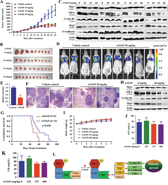 In nude mice (n = 10 for each group) subcutaneously inoculated with H1975 cells (2 × 106), intraperitoneal injection of 6-OAP at 10 to 20 mg/kg (once per day for 24 days) significantly inhibited tumor growth (Figure 5A and 5B), but did not reduce body weight of the mice (Figure S3I). 6-OAP treatment did not perturb Skp1 expression, but down-regulated NIPA and Skp2, and up-regulated Cyclin B1 and E-cadherin in tumor samples (Figure 5C). In SCID/Beige mice n=6 for control group and n=12 for 6-OAP treatment group injected with A549-luciferase cells (1 × 106), 20 mg/kg 6-OAP (intravenously injection, once every two days for 30 days) significantly suppressed tumor growth reflected by decrease of luciferase bioluminescence intensity (Figure 5D, 5E). 6-OAP reduced dissemination of disease and prevented destruction of tissue architectures (Figure 5F), and prolonged life span of the mice (Figure 5G). 6-OAP also induced downregulation of NIPA and Skp2 and up-regulation of Cyclin B1 in tumor samples (Figure 5H).