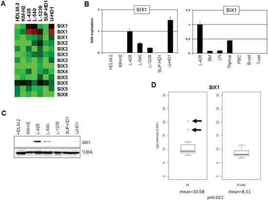 Figure 1: Expression of SIX1 in HL. A. Heatmap of profiling data for SIX genes in HL cell lines demonstrates enhanced expression of SIX1 in L-428, L-540, L-1236, and U-HO1. B. RQ-PCR analysis of SIX1 in HL cell lines (left) and primary hematopoietic cells and tissues (right), demonstrating aberrantly enhanced SIX1 expression in L-428. C. Western blot analysis of HL cell lines demonstrates strong SIX1 expression in L-428 and weak expression in L-540 and U-HO1. TUBA served as loading control. D. In silico expression analysis of SIX1 in primary samples obtained from HL patients and from healthy donors (GSE12453). The data indicate significantly enhanced SIX1 expression levels in HL patients and show SIX1 overexpression in two patients (arrows) as compared to normal B-cells.