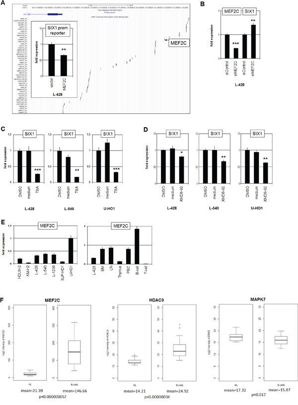 Figure 3: MEF2C inhibits SIX1 in HL. A. The regulatory upstream region of SIX1 contains several potential binding sites for TFs, including MEF2C at -5593 bp (UCSC Genome Bioinformatics). Reporter gene assay analysis of this binding site in L-428 cells (insert) demonstrates an inhibitory impact of MEF2C on SIX1 transcription. B. RQ-PCR analysis after siRNA-mediated knockdown of MEF2C in L-428 cells resulted in increased SIX1 expression, indicating suppression of SIX1 by MEF2C. C. RQ-PCR analysis of SIX1 transcripts in HL cell lines after treatment with HDAC-inhibitor TSA shows decreased expression levels. D. RQ-PCR analysis of SIX1 transcripts after treatment of HL cell lines with MAPK7-inhibitor XMD8–92 shows decreased expression levels. E. RQ-PCR quantification of MEF2C transcripts in HL cell lines (left) and primary hematopoietic cells and tissues (right) demonstrates reduced expression of MEF2C in L-428 as compared to BM and B-cells. F. In silico expression analysis of MEF2C (left), HDAC9 (middle), and MAPK7 (right) in primary samples obtained from HL patients and from healthy donors (GSE12453). The data indicate significantly reduced expression levels of MEF2C and HDAC9 and enhanced levels of MAPK7 in HL patients as compared to normal B-cells.