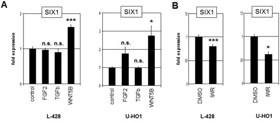 Figure 4: WNT-signalling activates SIX1 expression in HL. A. RQ-PCR analysis of L-428 and U-HO1 cells after treatment with FGF2, TGFb and WNT5B demonstrates activation of SIX1 expression by the WNT-pathway. B. RQ-PCR analysis of L-428 and U-HO1 cells after treatment with WNT-signalling inhibitor IWR confirms activation of SIX1 expression by WNT-signalling.