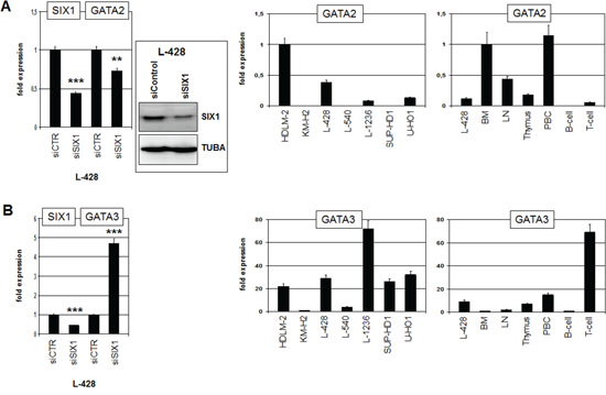 Figure 5: SIX1 regulates expression of GATA2 and GATA3. A. RQ-PCR analysis of GATA2 after siRNA-mediated knockdown of SIX1 in L-428 cells (left), demonstrating activation of GATA2 transcription by SIX1. Western blot analysis (left) confirmed reduced SIX1 expression after siRNA-mediated knockdown in L-428 cells. Quantification of GATA2 by RQ-PCR in HL cell lines (middle) and primary hematopoietic cells and tissues (right), demonstrating aberrant GATA2 expression in L-428 as compared to B-cells. B. RQ-PCR analysis of GATA3 after siRNA-mediated knockdown of SIX1 in L-428 cells (left), demonstrating suppression of GATA3 transcription by SIX1. Quantification of GATA3 by RQ-PCR in HL cell lines (middle) and primary hematopoietic cells and tissues (right), demonstrating GATA3 overexpression in L-428 as compared to B-cells.