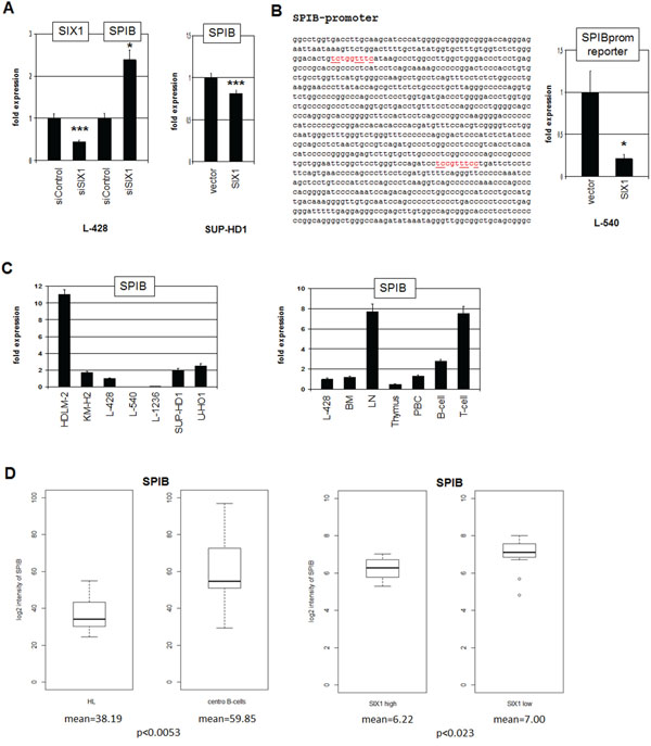 Figure 6: SIX1 inhibits SPIB expression in HL. A. RQ-PCR analysis of SPIB after siRNA-mediated knockdown of SIX1 in L-428 cells (left), demonstrating suppression of SPIB transcription by SIX1. Forced expression of SIX1 in SUP-HD1 cells results in reduced expression of SPIB (right), supporting its suppressive potential. B. Sequence analysis of the SPIB promoter region revealed two potential SIX1 binding sites at –892 bp and –320 bp (marked in red). Reporter gene assay analysis of these binding sites demonstrates an inhibitory impact of SIX1 on SPIB transcription (right). C. Quantification of SPIB by RQ-PCR in HL cell lines (left) and primary hematopoietic cells and tissues (right), demonstrating reduced SPIB expression in L-428 as compared to B-cells and LN. D. In silico expression analysis of SPIB in primary samples obtained from HL patients and from germinal center-B-cells of healthy donors (left, GSE12453). The data indicate significantly reduced SPIB expression levels in HL patients. In silico expression analysis of SPIB in primary samples, obtained from SIX1-positive and SIX1-negative HL patients (right, GSE12453). The data indicate significantly reduced SPIB expression levels in SIX1-positive HL patients.