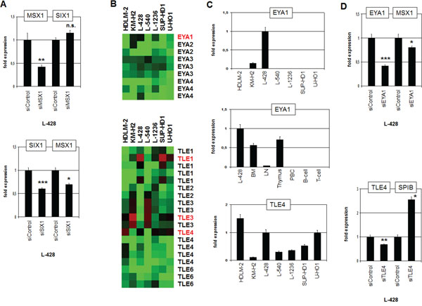 Figure 7: Analysis of MSX1 regulation and of SIX1-cofactors EYA1 and TLE4. A. RQ-PCR analysis of SIX1 after siRNA-mediated knockdown of MSX1 in L-428 cells (above) demonstrates absence of regulation. RQ-PCR analysis of MSX1 after siRNA-mediated knockdown of SIX1 in L-428 cells (below) demonstrating activation of MSX1 by SIX1. B. Heatmap of profiling data for EYA genes (above) and TLE genes (below) in HL cell lines demonstrates elevated expression of EYA1, TLE1 and TLE4 expression in L-428 (indicated in red letters). C. Quantification of EYA1 by RQ-PCR in HL cell lines (above) and primary hematopoietic cells and tissues (middle), demonstrating EYA1 overexpression in L-428. Quantification of TLE4 by RQ-PCR in HL cell lines (below) shows elevated TLE4 expression in L-428. D. RQ-PCR analysis of MSX1 after siRNA-mediated knockdown of EYA1 in L-428 cells (above), demonstrating activation of MSX1 transcription by SIX1-cofactor EYA1. RQ-PCR analysis of SPIB after siRNA-mediated knockdown of TLE4 in L-428 cells (below) demonstrates suppression of SPIB transcription by SIX1-cofactor TLE4.