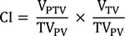 4. Conformity index (CI): A ratio used to evaluate the tightness of fit of the PTV to the prescription isodose volume [28]. A lower CI value indicates better conformity.