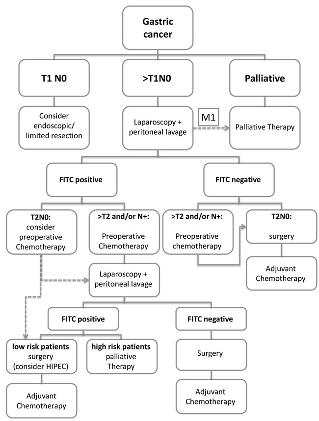 There is indeed increasing effort to identify patients with gastrointestinal malignancies and peritoneal metastases who benefit from intensified therapies such as HIPEC [84-86]. At present, these efforts mainly focus on patients with overt peritoneal metastases and showed promising results for colorectal cancer [87, 88]. The findings were much more modest for gastric cancer patients with overt peritoneal metastasis [89, 90] and may be explained by limitations to achieve complete cytoreduction [91]. These data suggest FITC positive gastric cancer without further distant metastasis as a promising subgroup of patients who might benefit from HIPEC. The first randomized controlled study to examine the benefit of extensive intraoperative peritoneal lavage followed by intraperitoneal chemotherapy in FITC positive gastric cancer showed promising results [92]. Further randomized controlled trials have already been initiated (ClinicalTrials.gov; NCT01683864). The results may redefine the treatment of FITC positive gastric cancer.