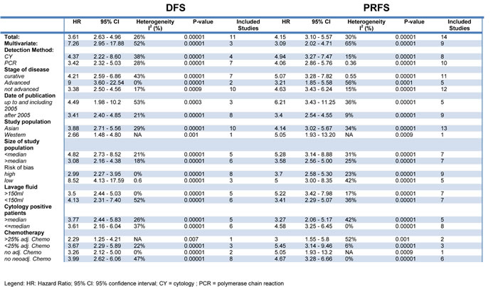 Subgroup analyses were performed to assess the impact of the detection method on the results. These analyses revealed a prognostic association of FITC detection by cytology with OS (3.03; 2.55 - 3.61; n = 35; I² = 78%) [10, 11, 13, 15-19, 21, 22, 24, 25, 28, 30, 33, 34, 38-41, 43, 44, 46, 47, 49-52, 57, 60, 61, 63, 65, 66, 69]. Despite a lower number of studies we observed a more pronounced prognostic value for pooled analyses of studies using RT-PCR (3.64; 2.93 - 4.53; n = 19; I² = 49%) [12, 20, 23, 26, 35, 38, 42, 45, 48, 53, 55-57, 59, 62, 64, 65, 67, 68]. This difference reached statistical significance in the test of interaction for the subgroup of patients who underwent potentially curative resection (p = 0.012). The kind of detection method had no impact on the prognostic value with respect to DFS and PRFS (Table 3, Table 4).