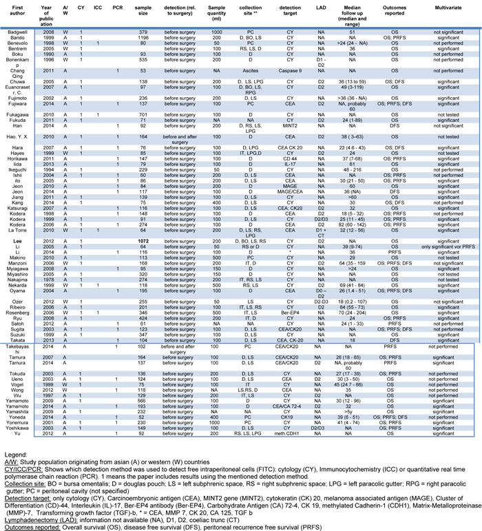 The following data was extracted from every article: first author, year of publication, study type, enrolment period, sample size, patient age and sex, FITC detection rate, definition of positive peritoneal fluid/lavage, timing of FITC detection, detection protocol, target genes and antigens, chemotherapy (neoadjuvant and/or adjuvant, treatment regimen), duration of follow up, reported outcomes and the use of multivariate models. The data for each included article were extracted independently by two authors (MP and MA). Diverging results were resolved by discussion.