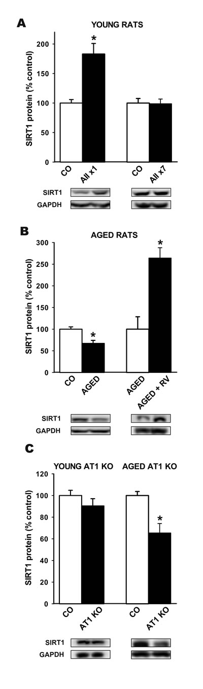 Activation of the AII/AT1 pathway is known to be enhanced in the substantia nigra of aged rats; see [33] for details. However, levels of SIRT1 in aged rats were significantly lower than in young controls. Interestingly, treatment with resveratrol significantly increased the levels of SIRT1 in the nigral region of aged rats (Figure 2B). We also compared SIRT1 levels in the nigral region of aged AT1 KO mice (18 months old) and wild type mice of the same age. Levels of SIRT1 were significantly higher in aged wild type mice than in AT1 KO mice (Figure 2C). However, no significant differences were observed between young wild type controls and young AT1 KO mice (Figure 2C).