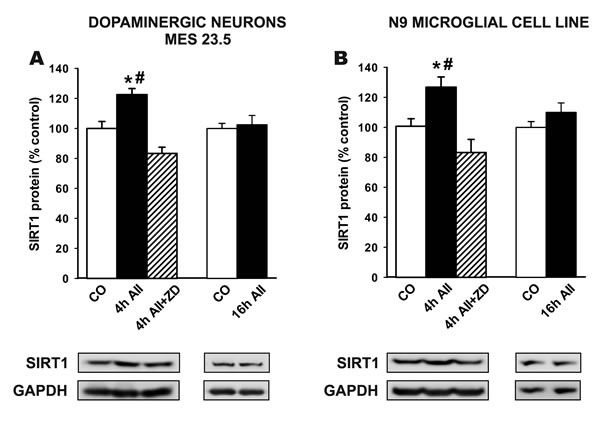 Figure 3: Western blot analysis of changes induced by treatment with AII (100 nM) in the expression of SIRT1 in the dopaminergic cell line MES 23.5 A. and the N9 microglial cell line B. The AII-induced increase in SIRT1 expression was inhibited by the AT1 receptor antagonist ZD-7155. Protein expression was measured relative to the GAPDH band value. The results were normalized to the values for controls (100%). Data are means ± SEM. *p < 0.05 relative to controls; #p < 0.05 relative to AII+ZD group (one-way ANOVA followed by Student-Newman Keuls). AII, angiotensin II; CO, control; ZD, AT1 antagonist ZD-7155.
