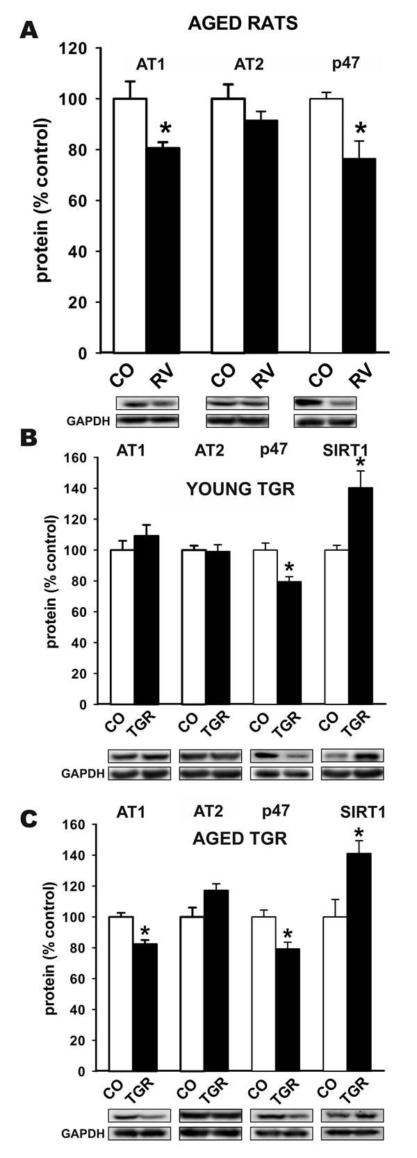Figure 4: Western blot analysis of changes in the expression of angiotensin receptors (AT1 and AT2) and NADPH-oxidase activation (i.e. p47phox subunit expression) in the nigral region in aged rats treated with resveratrol or vehicle A., and in young B. and aged C. transgenic mice over-expressing SIRT1 relative to wild type controls of the same age. Protein expression was measured relative to the GAPDH band value. Protein expression was measured relative to the GAPDH band value. The results were normalized to the values for controls (100%). Data are means ± SEM. *p < 0.05 relative to controls (Student’s t test). CO, control; p47, p47phox; RV, resveratrol, TGR, transgenic mice over-expressing SIRT1.