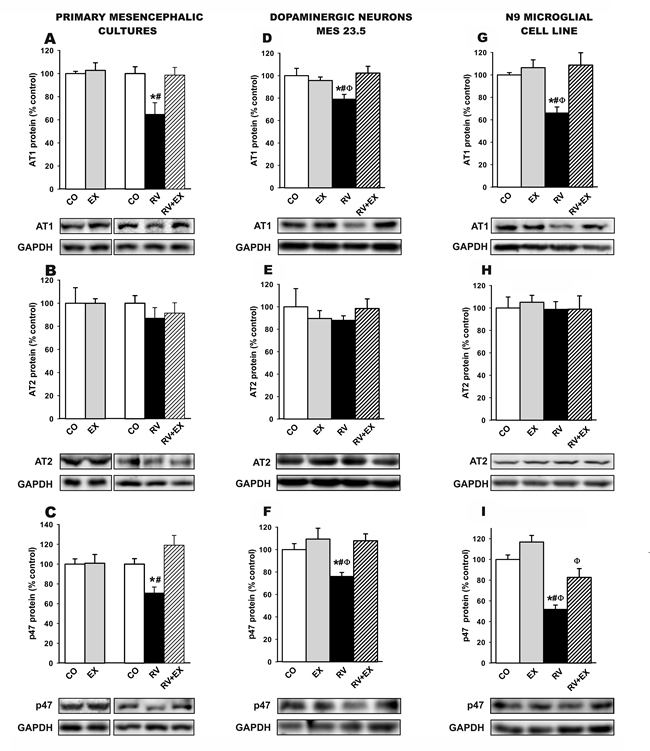 Figure 5: Western blot analysis of changes induced by treatment with resveratrol (RV) and resveratrol plus the SIRT1 specific inhibitor EX527 (RV+EX) in the expression of angiotensin receptors (AT1 and AT2) and NADPH-oxidase activation (i.e. p47phox subunit expression) in primary (neuron-glia) mesencephalic cultures A.-C., the dopaminergic cell line MES 23.5 D.-F. and the N9 microglial cell line G.-I.. The RV-induced decrease in AT1 and p47phox subunit expression was inhibited by the SIRT1 specific inhibitor EX527. Protein expression was measured relative to the GAPDH band value. The results were normalized to the values for controls (100%). Data are means ± SEM. *p < 0.05 relative to controls, #p < 0.05 relative to RV+EX, φp < 0.05 relative to EX (one-way ANOVA followed by Student-Newman Keuls). AII, angiotensin II; CO, control; EX, SIRT1 inhibitor EX527; p47, p47phox; RV, resveratrol.