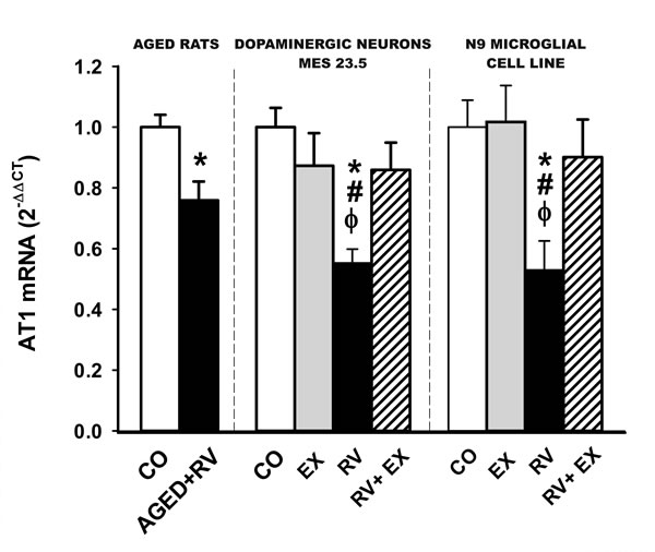 Figure 6: Real-time quantitative RT-PCR analysis of changes in the expression of AT1 in the nigral region in aged rats treated with resveratrol or vehicle, and in cultures of the dopaminergic cell line MES 23.5 and the N9 microglial cell line treated with resveratrol or resveratrol plus the SIRT1 specific inhibitor EX527. The comparative cycle threshold values method (2 −∆∆Ct) was used. The expression of each gene was measured relative to that of the housekeeping transcripts (β-Actin). Data are means ± SEM. *p < 0.05 relative to controls, #p < 0.05 relative to RV+EX, φp < 0.05 relative to EX (Student’s t test and one-way ANOVA followed by Student-Newman Keuls). CO, control; Ct, cycle threshold; EX, SIRT1 inhibitor EX527; RV, resveratrol.
