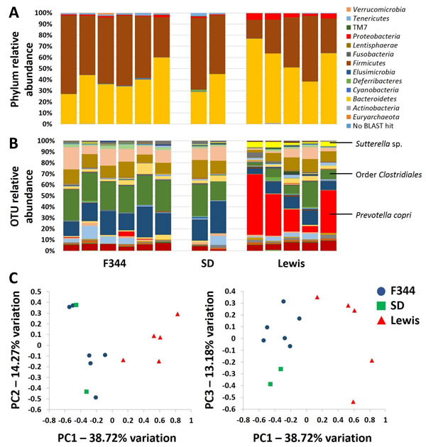 Figure 1: The gut microbiota of Lewis rats differs qualitatively from that of F344 and SD rats. Bar charts showing the relative abundance of microbes in the gut microbiota of F344 (n = 6), SD (n = 2), and Lewis (n = 5) surrogate dams 24 hours pre-partum, annotated to the level of phylum (A. legend at right) and operational taxonomic unit B.; Principal component analysis of the samples depicted in A and B, showing complete separation of Lewis dams from F344 and SD dams along principal component 1 C.