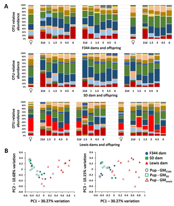 Figure 2: Rederived pups acquire the gut microbiota of their surrogate dam. Bar charts showing the OTU relative abundance of representative F344, SD, and Lewis dams and three F344-Pirc pups born to those dams at weaning (21 days), 1 month (1m), 1.5m, 3m, 4.5m, and 6m of age A. Principal component analysis (PCA) of all surrogate dams (n = 13) and all male F344-Pirc pups born to those dams (n = 21) at 1.5 months of age (B. legend at right).