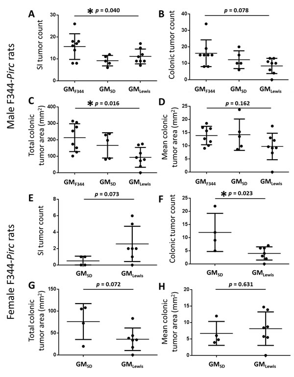 Figure 3: Rats colonized with GMLewis develop less severe disease than rats harboring GMSD or GMF344. Dot plots demonstrate the mean (± SD) small intestinal (SI) tumor count (A., E.), colonic tumor count (B., F.), total colonic area affected by tumors (C., G.), and mean colonic area of individual tumors (D., H.) in male (A-D) and female (E-H) F344-Pirc rats colonized with the GM acquired from their cognate surrogate dam. P values denote results of one way ANOVA (males) or t-test (females) and asterisks indicate p ≤ 0.05.